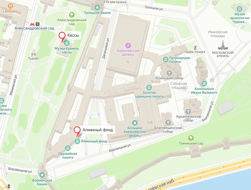 Приобрести билеты на Выставку "Алмазный фонд" можно в экскурсионно-кассовом павильоне в Александровском саду.